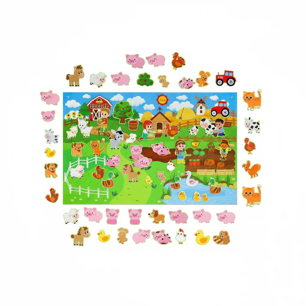 Votre set comprend un grand tableau en feutre représentant une scène de ferme joyeuse, et une collection enchanteresse de personnages et d'éléments en feutre. Tout est là pour que votre enfant puisse créer des histoires sans fin et stimuler son éveil!